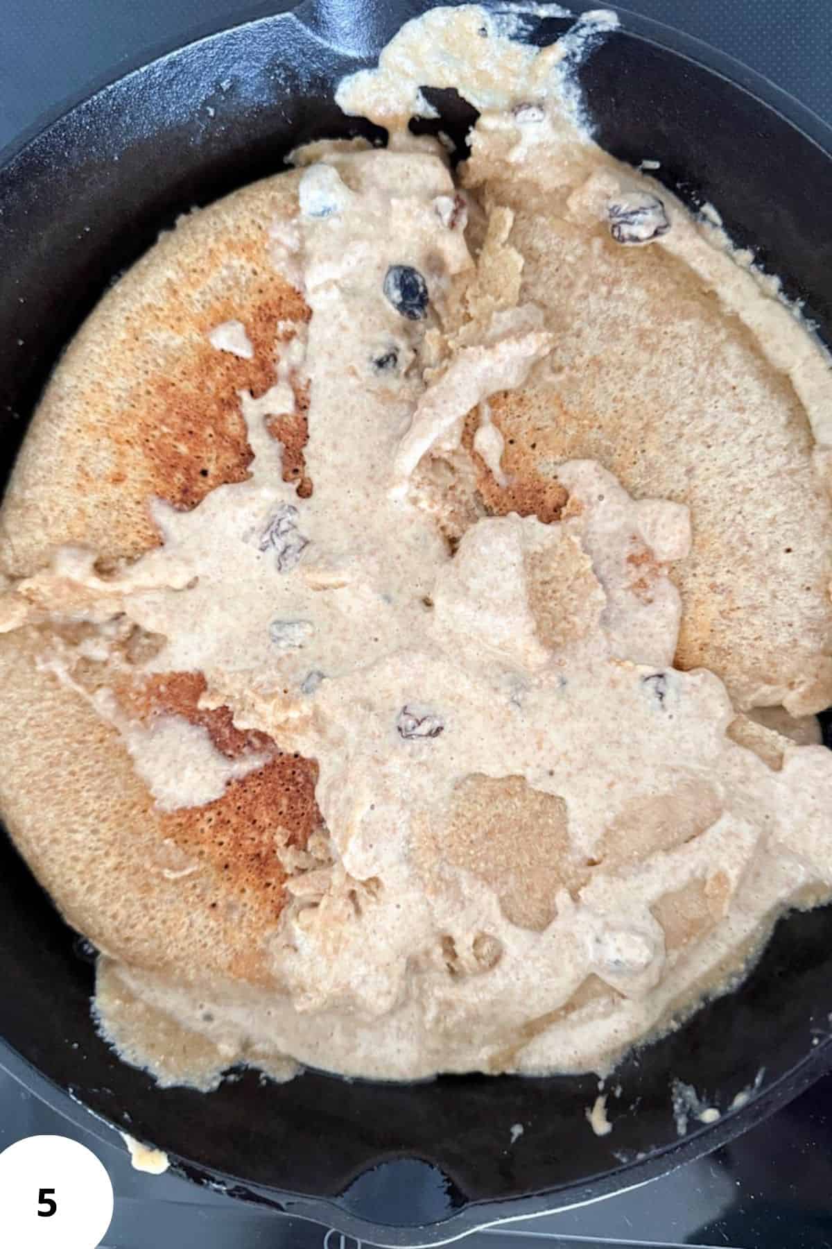 Pour the batter into the skillet so it sits about 1–2 cm (⅓–⅔ inch) thick. Add the raisins on top if you’re using them (Image 4).