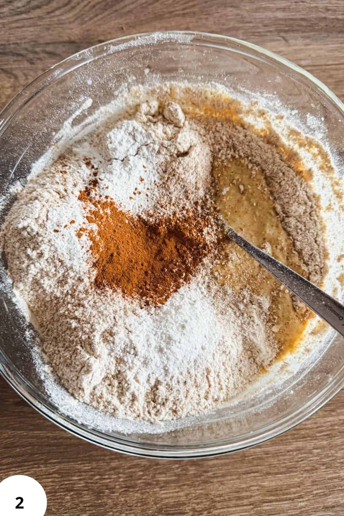 Step 2: Add the fresh milled flour, baking powder, salt, and cinnamon (Image 2). Stir just until everything comes together. Don’t overmix.