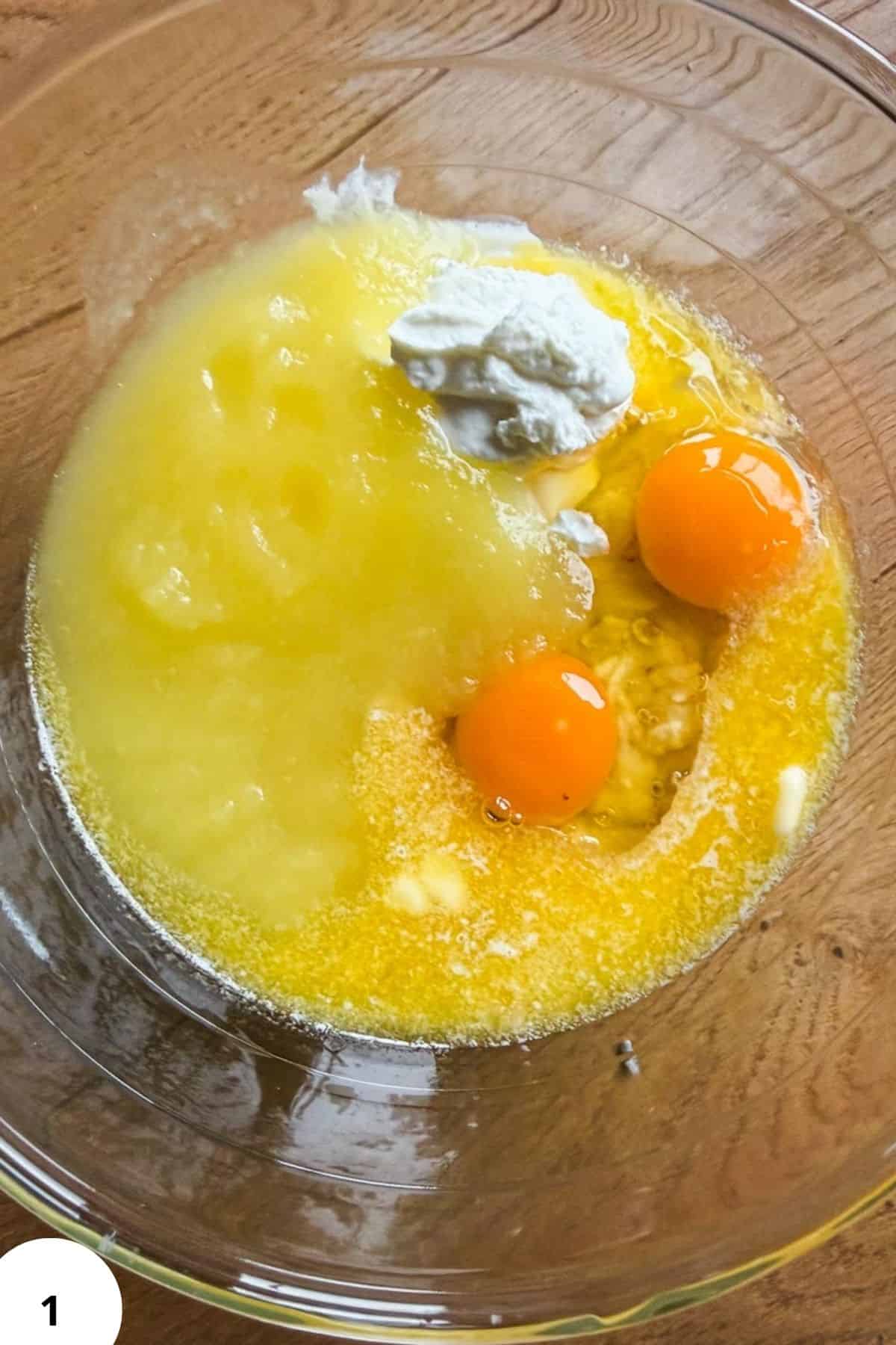 In a large bowl, mash the bananas. Add applesauce, melted butter, and eggs. Mix until combined (Image 1).
