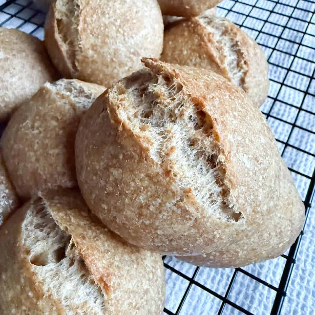 Freshly baked bread rolls with a crunchy crust on a cooling rack.